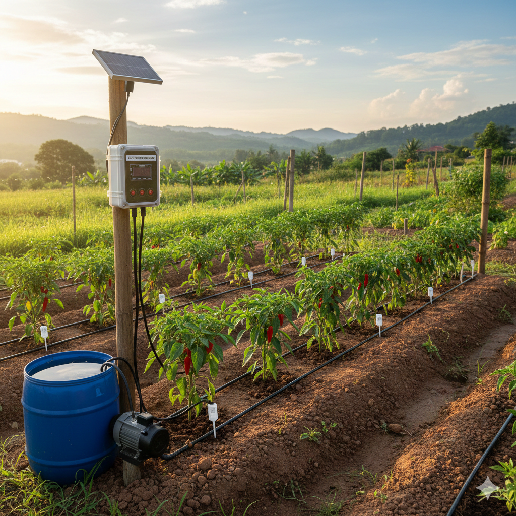 Sistem irigasi otomatis menggunakan sensor kelembaban tanah untuk pertanian dan kebun skala kecil.