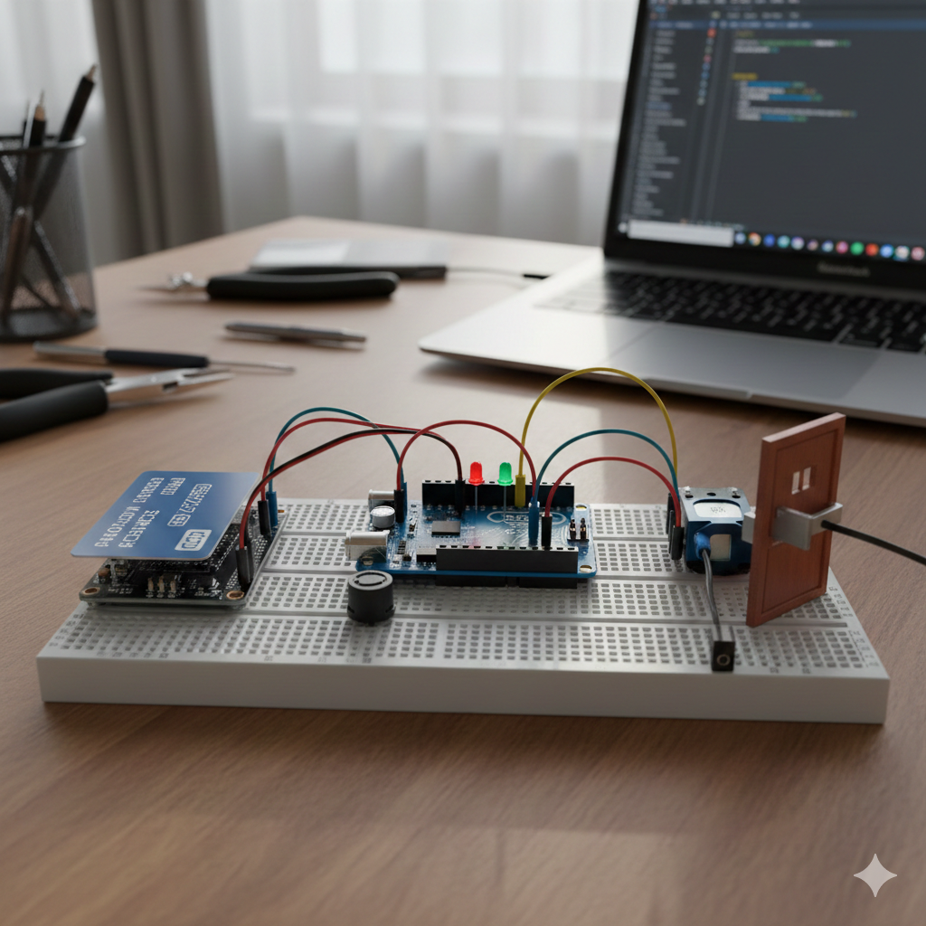 Proyek pengaman pintu berbasis Arduino menggunakan sensor RFID, buzzer, dan indikator LED.