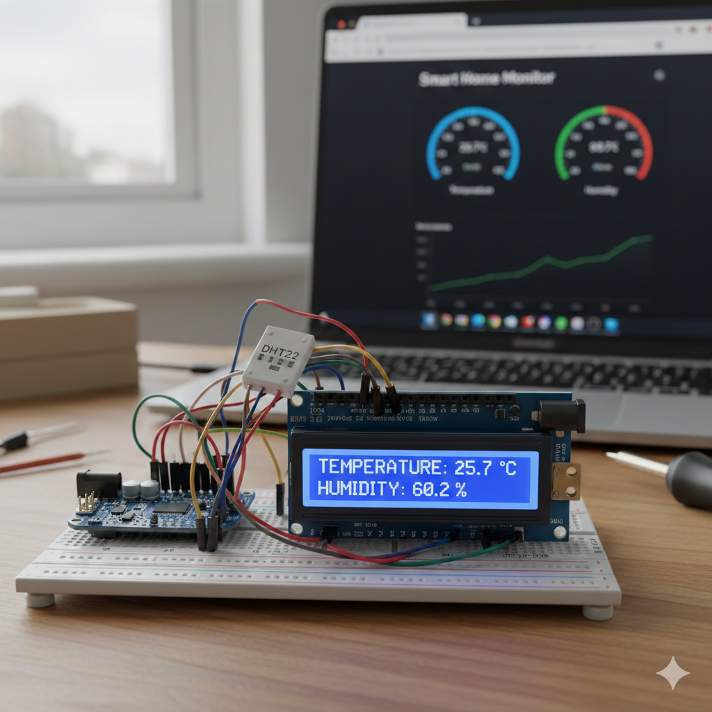 Menggunakan sensor DHT11/DHT22 untuk memantau suhu dan kelembaban yang ditampilkan melalui LCD dan website.
